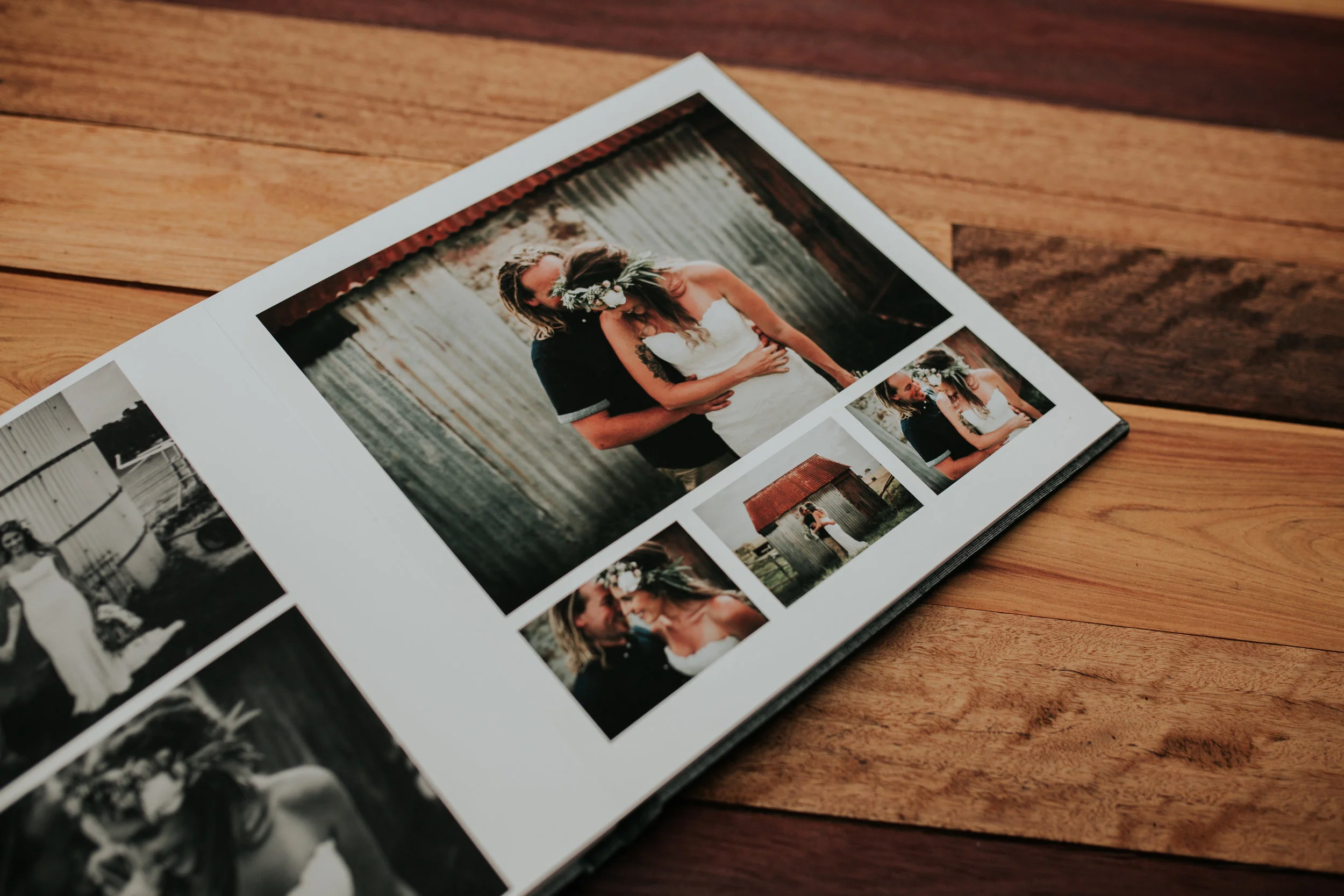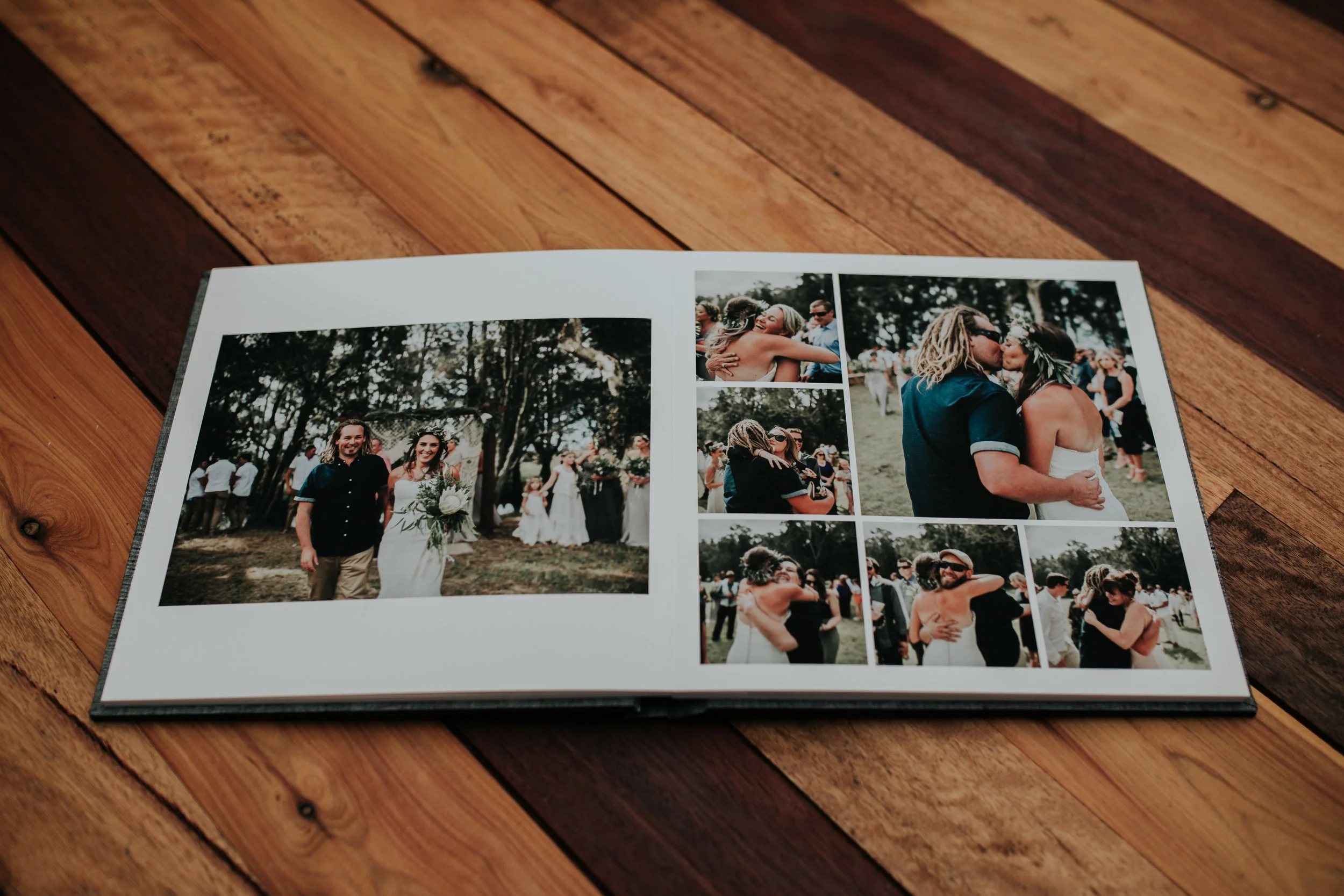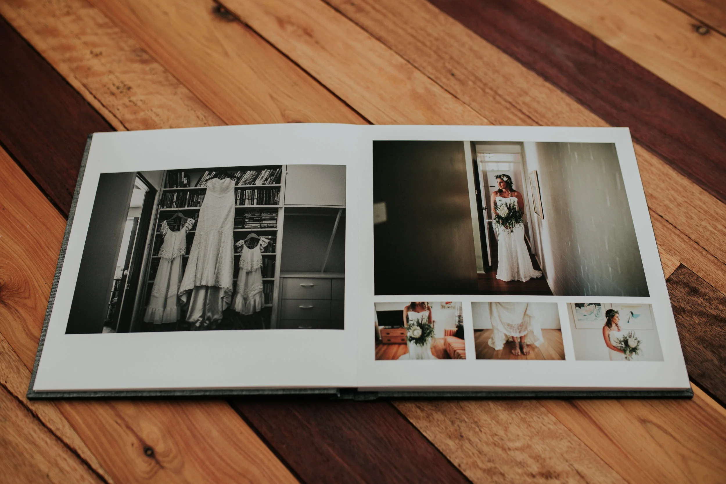 My albums come standard at 10"x10" or 12"x12" square. They come with different cover colour options as well as embossed text on the cover. Every album is printed on museum quality, fine art paper with archival inks. Which means the album will last for generations and generations without fading or discolouring. The seamless binding ensures that there are no messy or distracting lines down the middle of your albums, allowing you to have full page spreads. Aside from all that, they do look and feel ridiculously good!