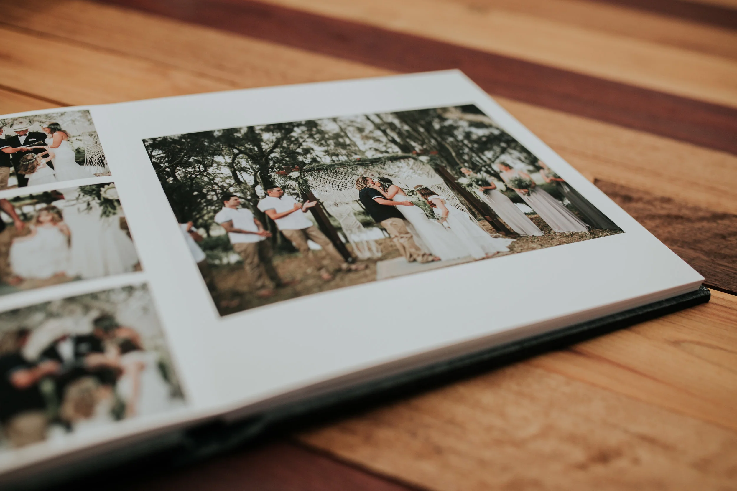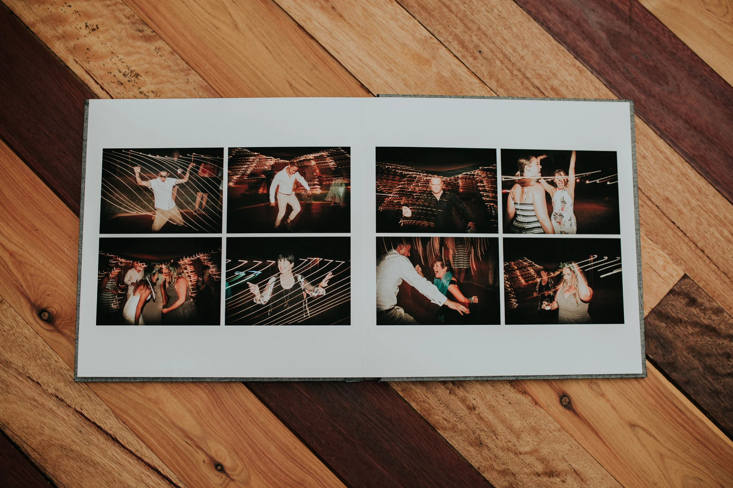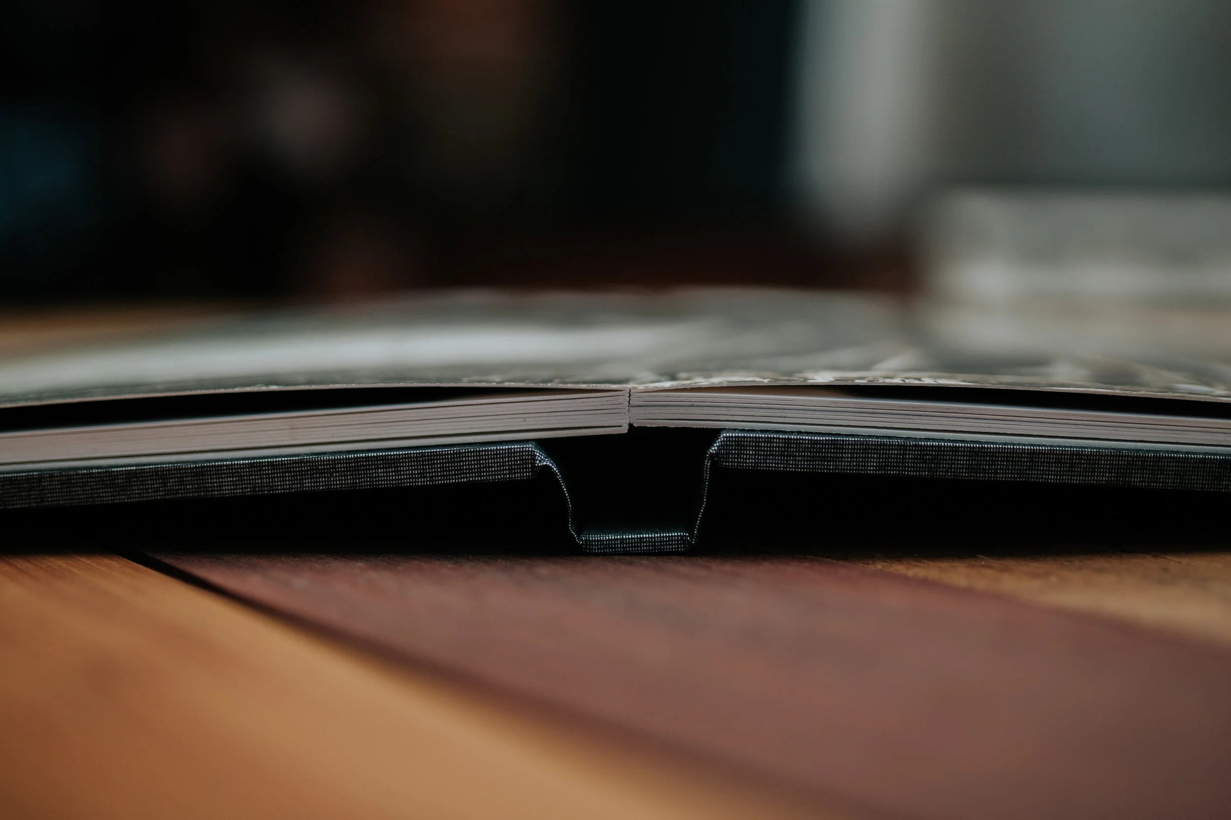 My albums come standard at 10"x10" or 12"x12" square. They come with different cover colour options as well as embossed text on the cover. Every album is printed on museum quality, fine art paper with archival inks. Which means the album will last for generations and generations without fading or discolouring. The seamless binding ensures that there are no messy or distracting lines down the middle of your albums, allowing you to have full page spreads. Aside from all that, they do look and feel ridiculously good!